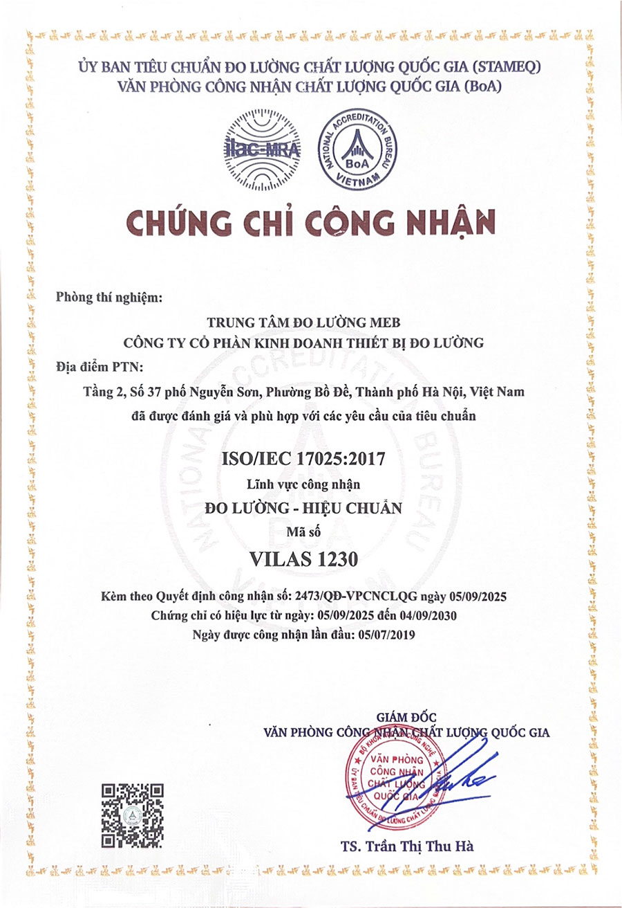 Chứng nhận VILAS:1230 theo tiêu chuẩn ISO/IEC 17025: được công nhận bởi Văn Phòng Công nhận Chất lượng (BoA) - Bộ Khoa học và Công nghệ.